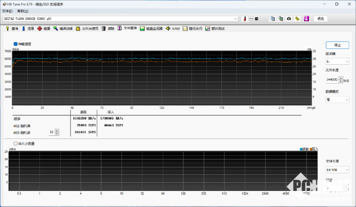 而在HD Tune Pro的测试中,从文件基准的测试情况来看,致态Ti600的整体表现也很出色,在200GB数据写入量的情况下,表现十分稳定,没有出现明显的波动。当我们将数据写入量设定为244GB时(HD Tune最大标定为250GB,超出提示I/O错误),可以发现整个读取曲线都没有明显下降,性能十分稳定。虽然是模拟缓存,但这个缓存容量还是够大的,能够满足我们日常的大容量存储需求。