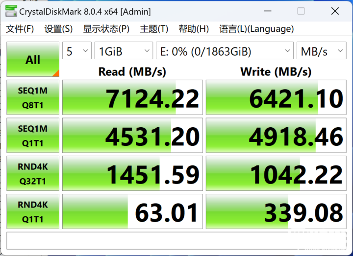 在CrystalDiskMark 8.0.4版本的测试中,致态Ti600在Q32队列深度下的顺序读取速度高达7124.22 MB/s,顺序写入速度为6421.10 MB/s,表现十分优秀,均超过了官方标称速度。单队列单线程的4K随机读取速度为63.01 MB/s,4K随机写入速度为339.08 MB/s,读取速度一般,但写入速度还是十分优秀的水平。
