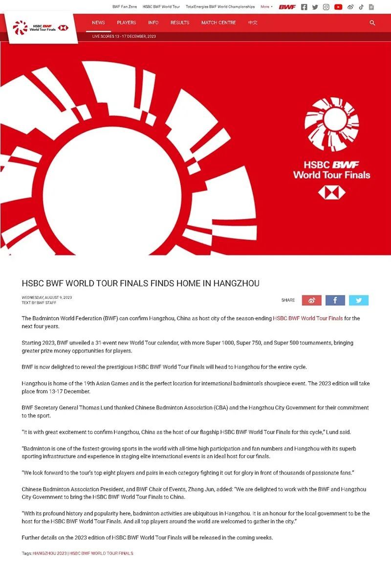 今年12月份,2023-2026世界羽联世界巡回赛总决赛就将登陆杭州,成为后亚运时代杭州举办的首个国际顶级赛事。