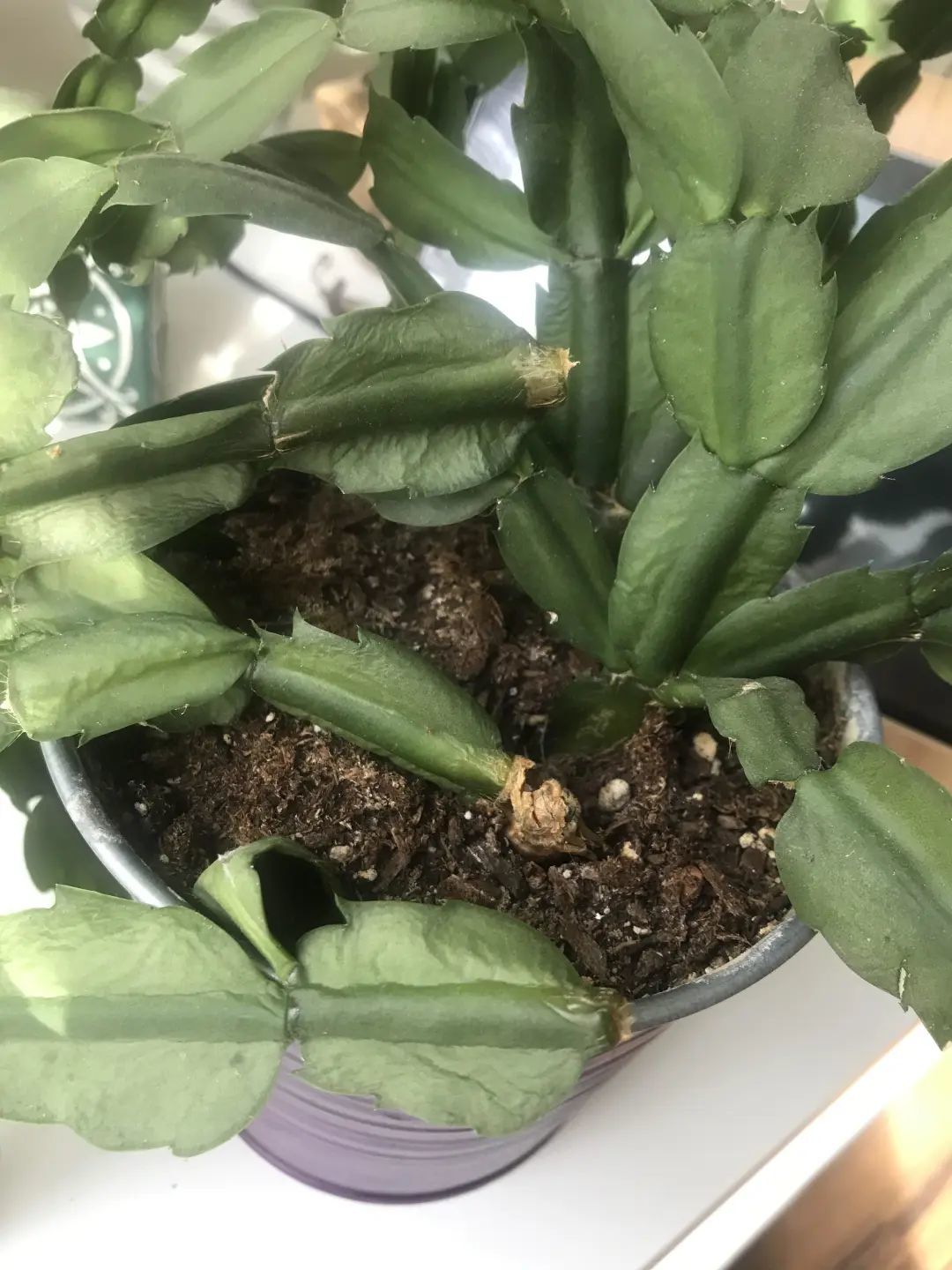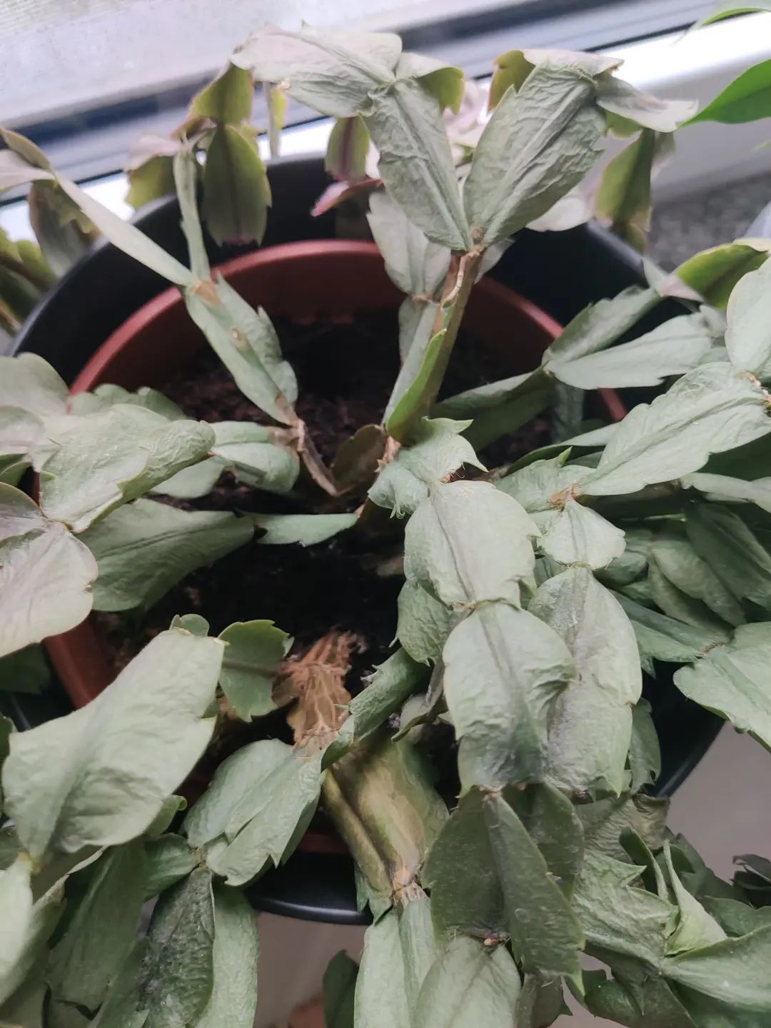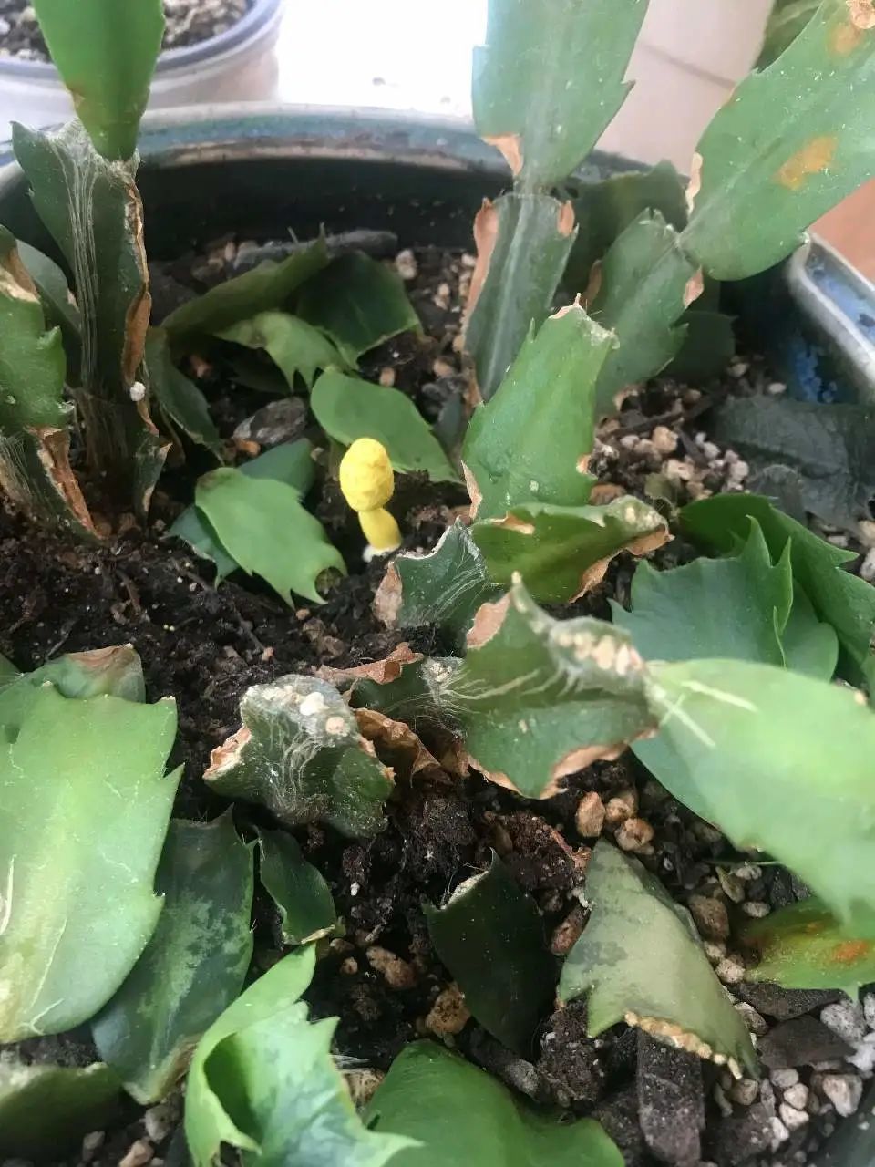蟹爪兰还容易感染一个病害,就是叶腐病,在室内植物中,特别是多肉植物,都是极其常见的,这是一种真菌病害,真菌孢子会附着在叶子上,导致叶子腐烂。