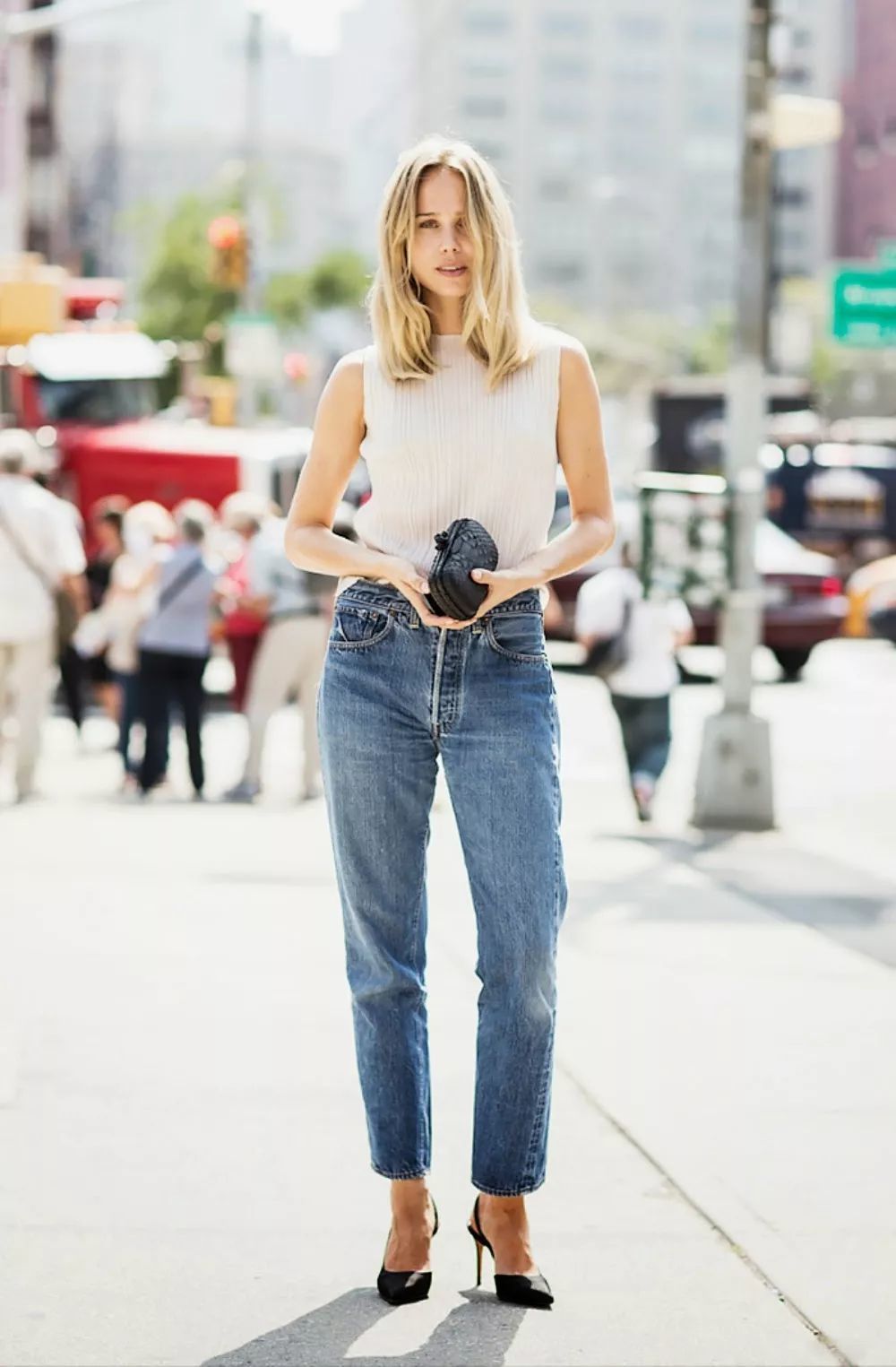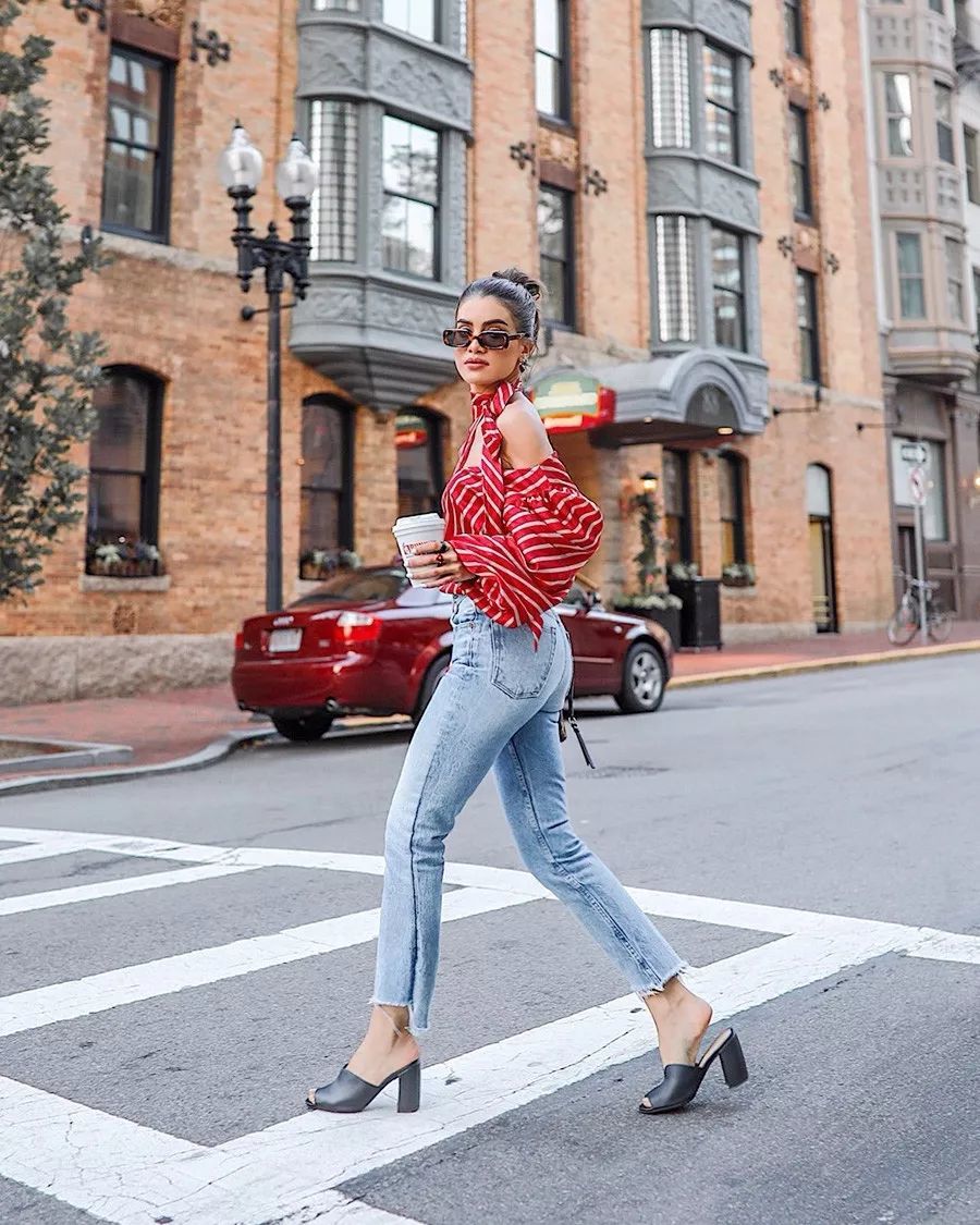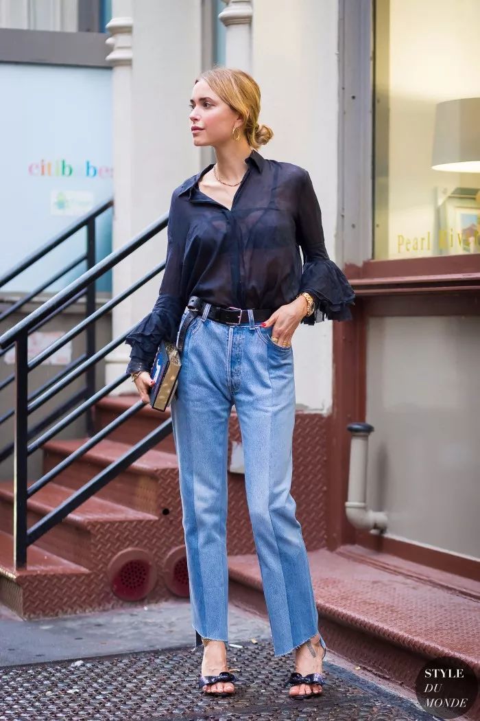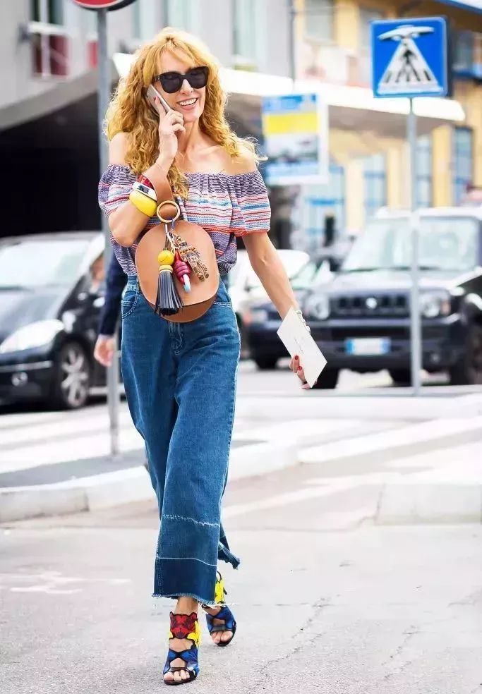 塞衣角是最简单的显高穿法,搭配高腰的妈妈裤和尖头高跟鞋,更显身材修长。