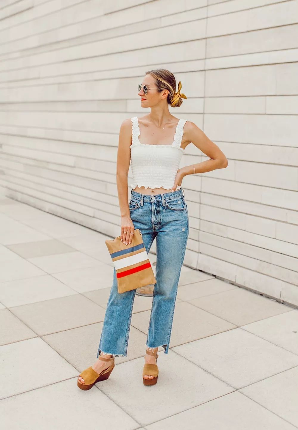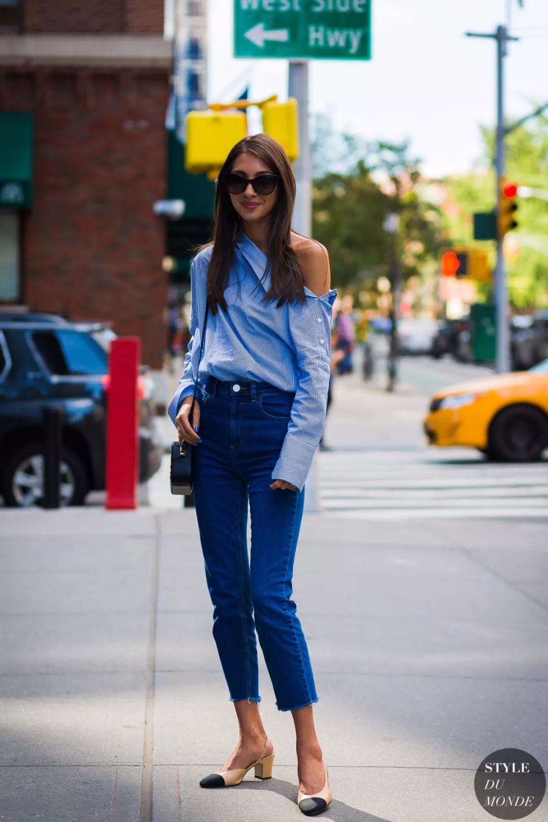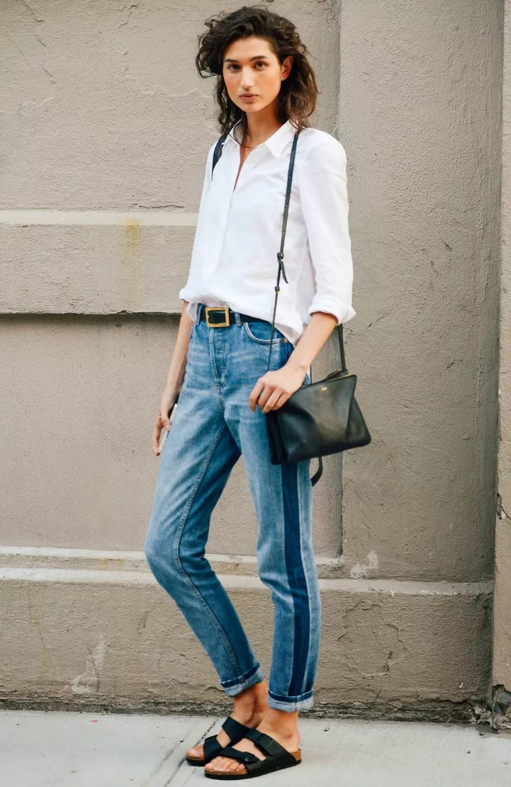塞衣角是最简单的显高穿法,搭配高腰的妈妈裤和尖头高跟鞋,更显身材修长。