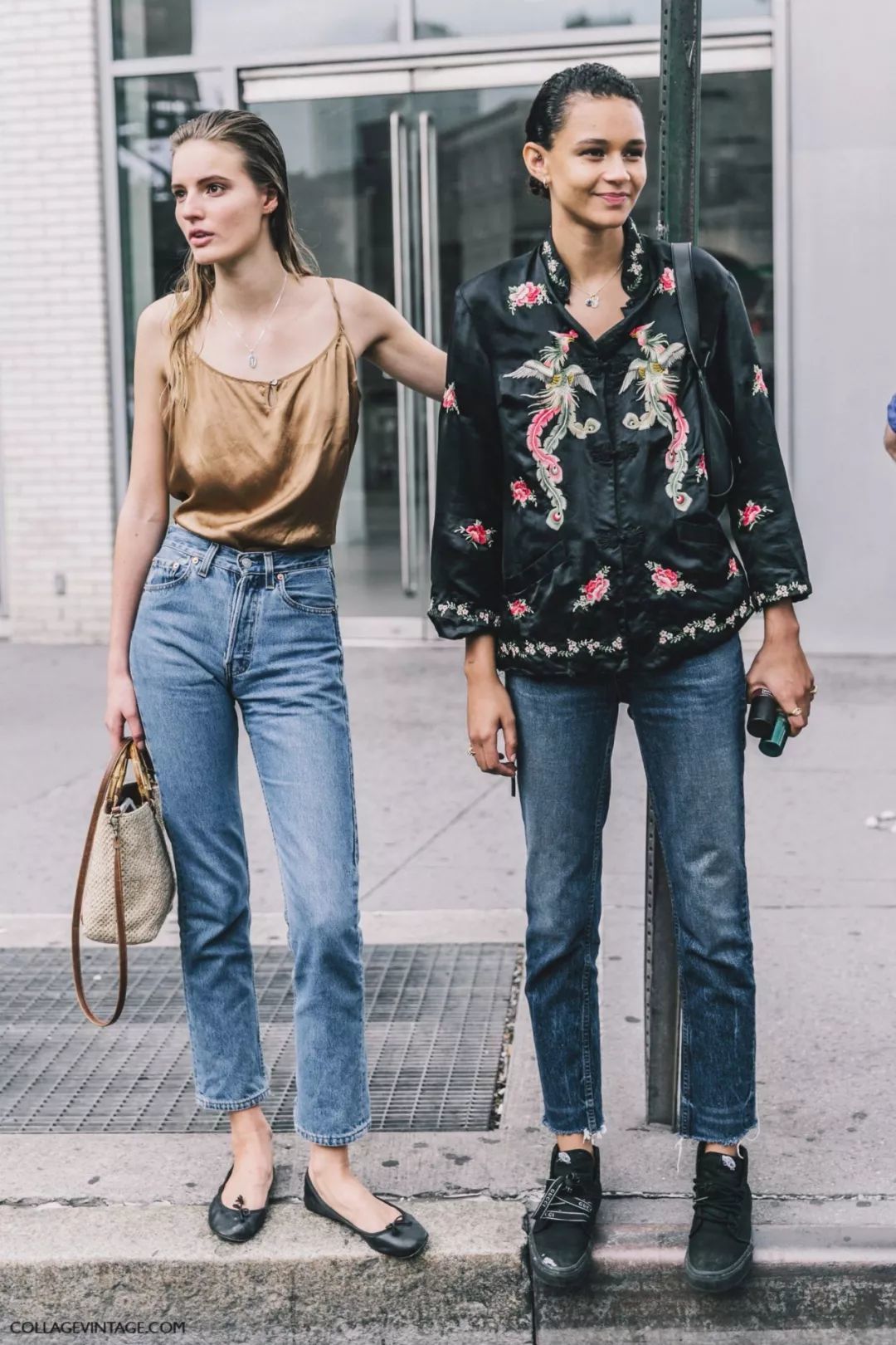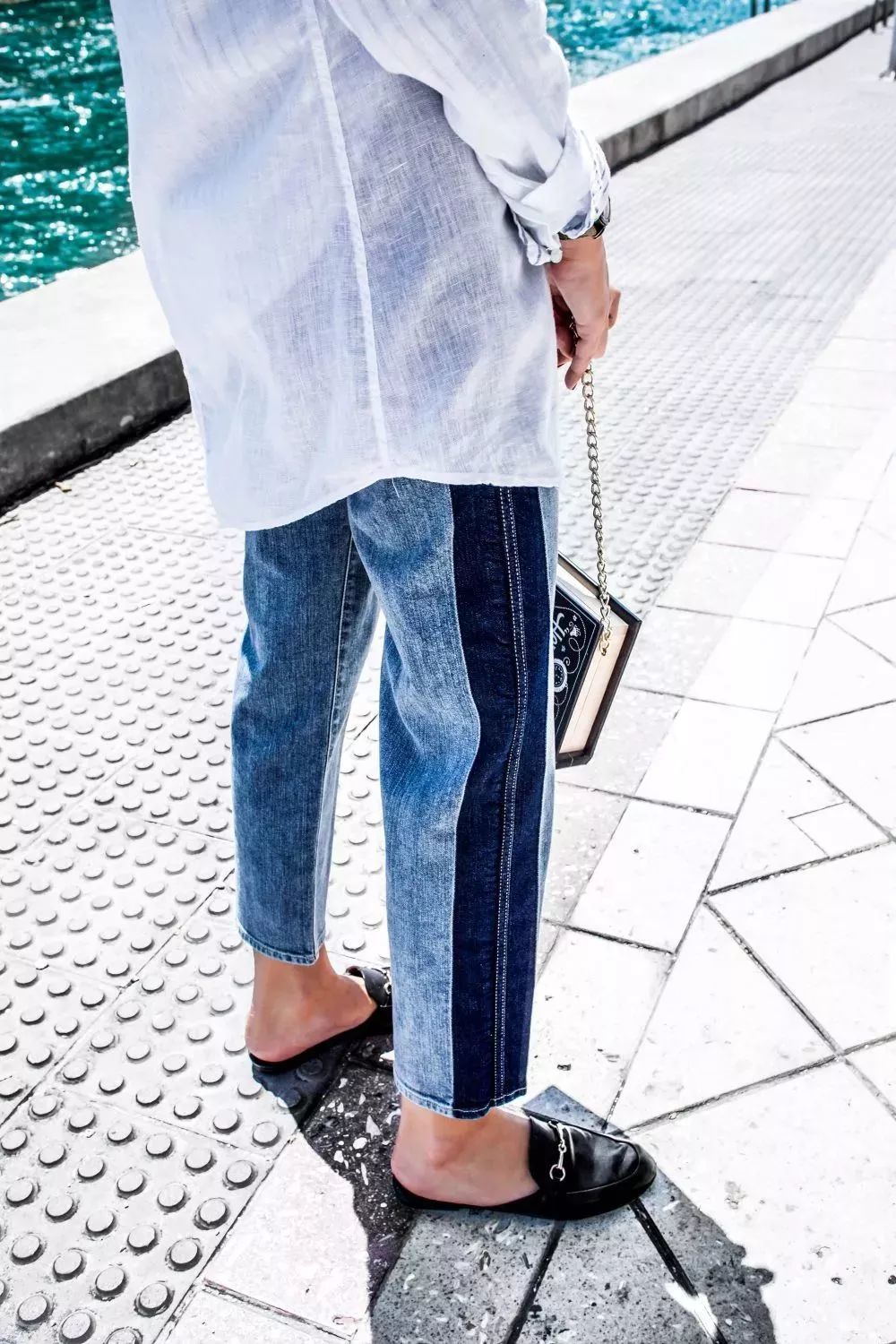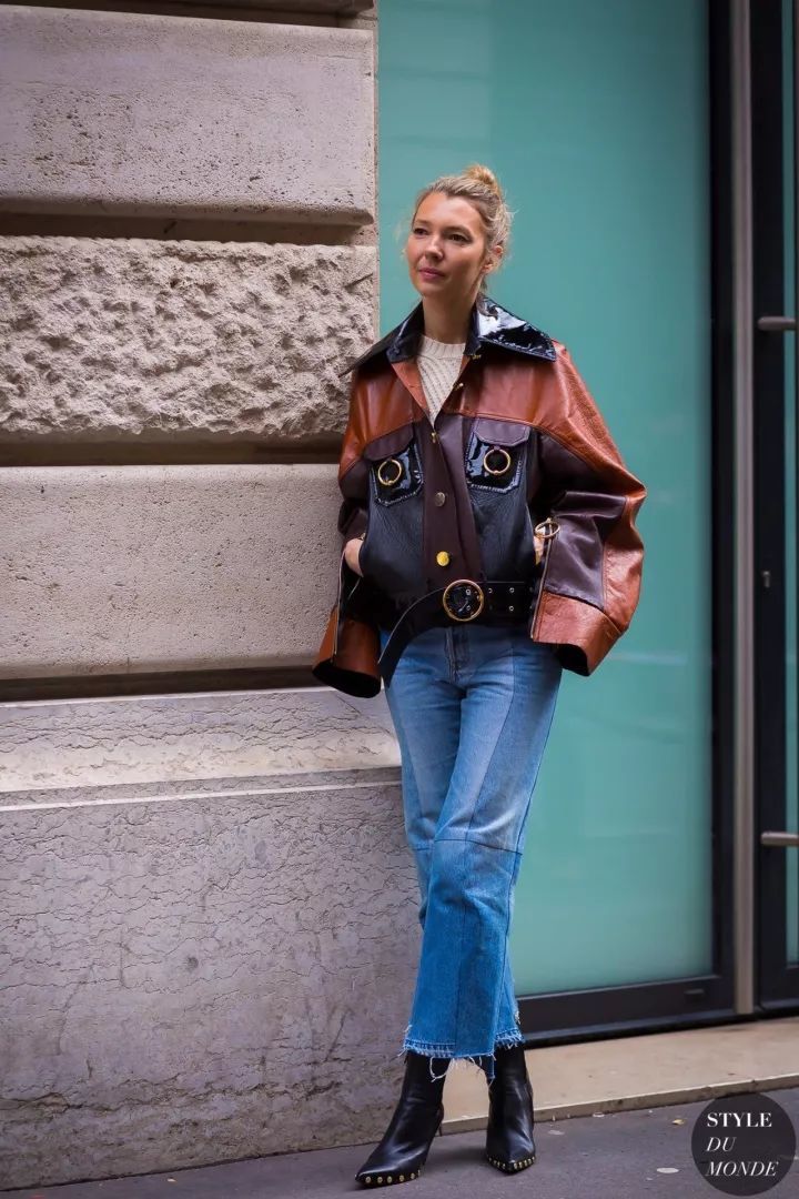 牛仔裤也不一定是单色的,拼接撞色的款式能让你看起来更具时髦感。