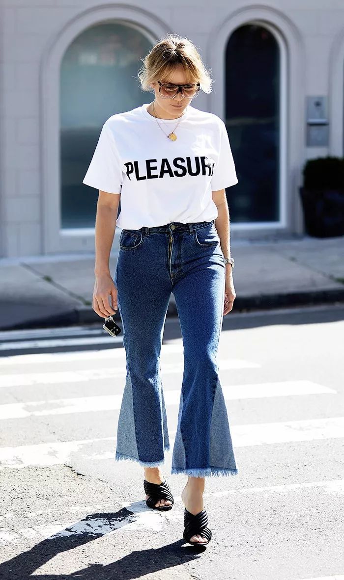 阔腿裤裤脚的三角形拼接类似开衩的效果,既能修饰腿型的不完美,又不会让下半部分太过沉重,搭配 T 恤十足的街头范儿。
