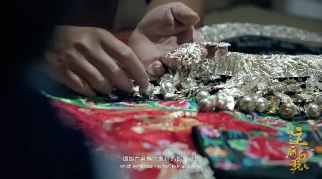 苗族人没有文字,苗银刻画的各种纹样,如凤凰、蝴蝶、牛角就是他们的文字。蝴蝶在苗族文化中象征妈妈,牛角象征力量,刻画在银饰上,就是对人最真诚的祝福。