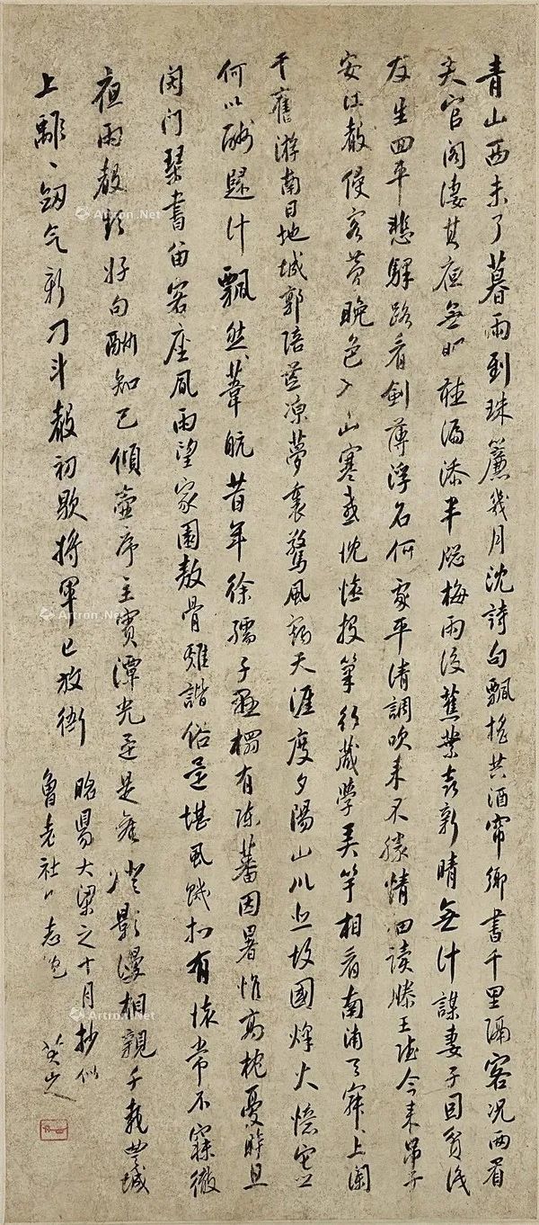 我们能够看到文徵明的这件作品受到元四家的影响,尤其在笔法上面学习了黄公望。作为明代吴门画家的一个非常重要的代表人物,他对后代的影响,对元四家山水画风格在明清的广泛传播起到重要的作用。