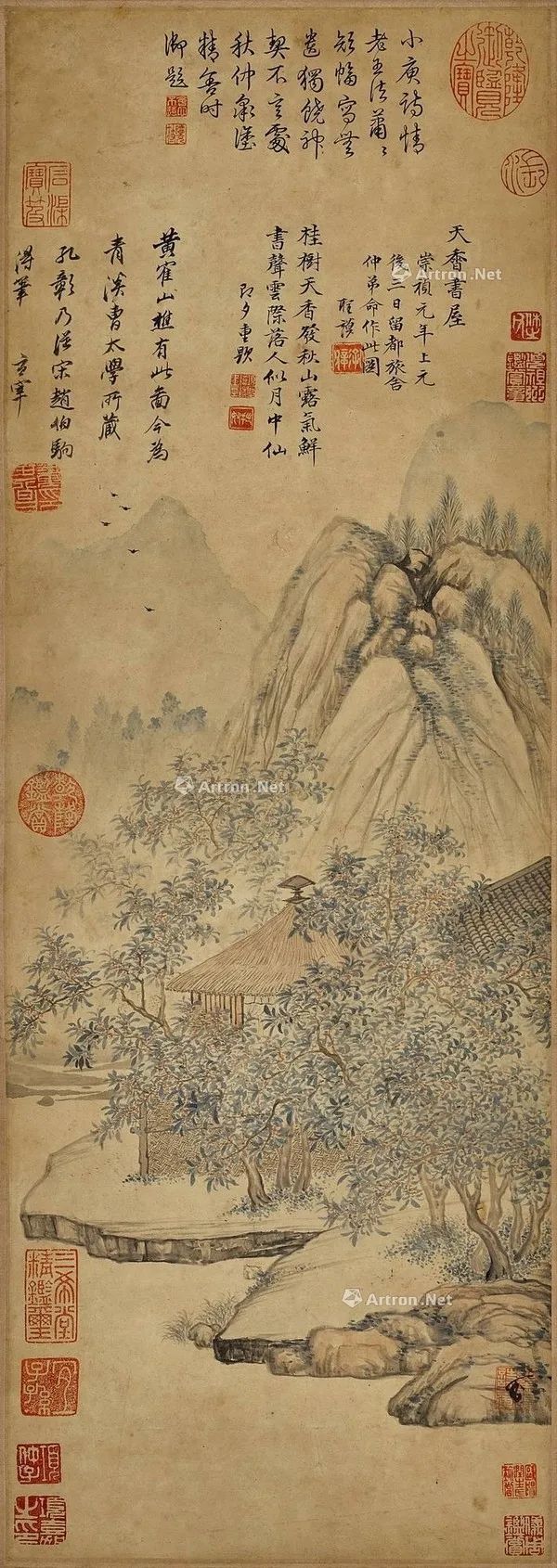 另有项圣谟《天香书屋》,为清宫旧藏、宫廷原装旧裱,上有董其昌的题跋还有乾隆的御题诗画。此作体现出明代文人画清雅俊逸的格调。