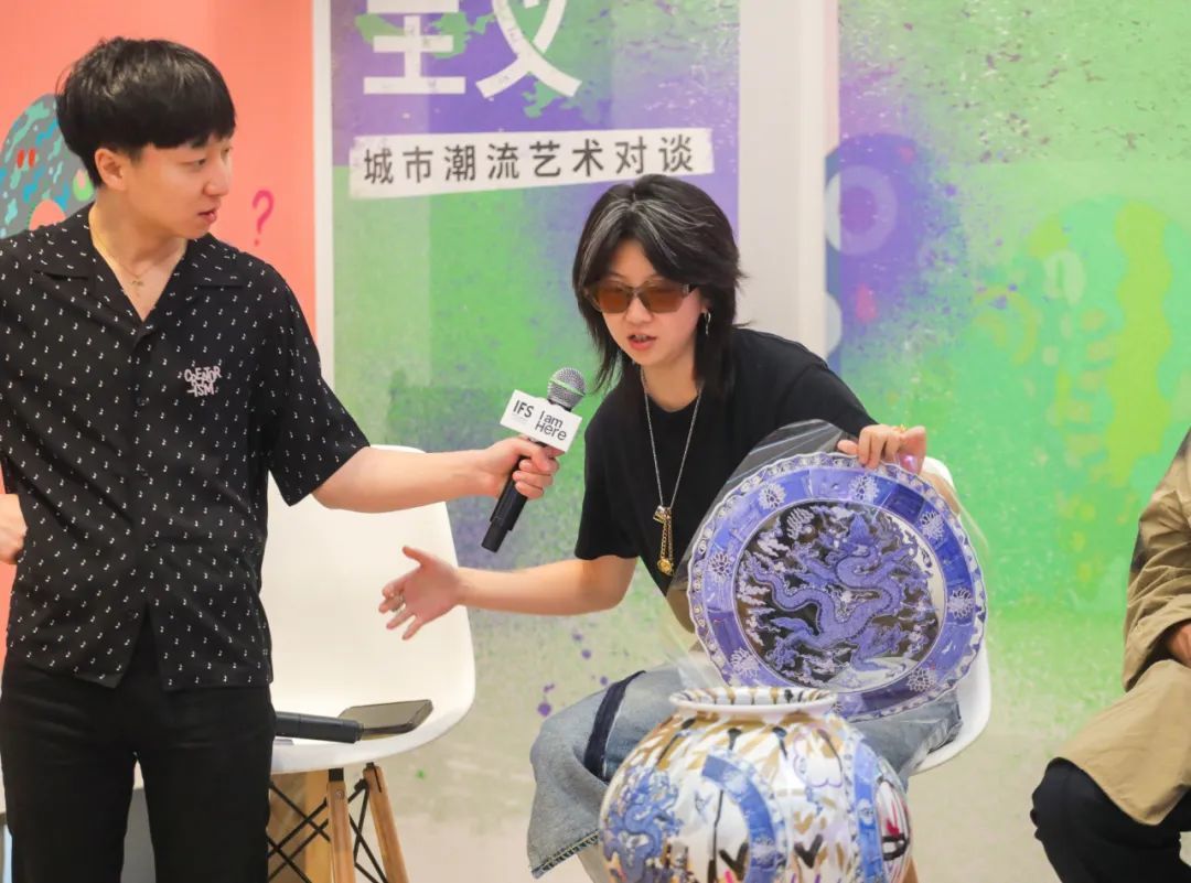 在探讨艺术与时代、空间的主题对谈环节,策展人与艺术家进行了思想碰撞,他们进行创作时会十分关注如何更自然地表达城市性格,通过不同艺术形式来讲述所处空间的独特故事。在论坛压轴的艺术家对谈环节,三位中国青年艺术家与神山隆二先生从涂鸦这种不羁的街头文化如何衍生出多元化的表达,谈到自己的艺术成长历程,引发现场嘉宾的热烈共鸣。青年艺术家薛熳XUE现场展示了自己基于神山先生现有作品再创作的艺术品,将中国传统青花龙纹瓷盘图纹镶嵌于涂鸦陶瓷罐之上。