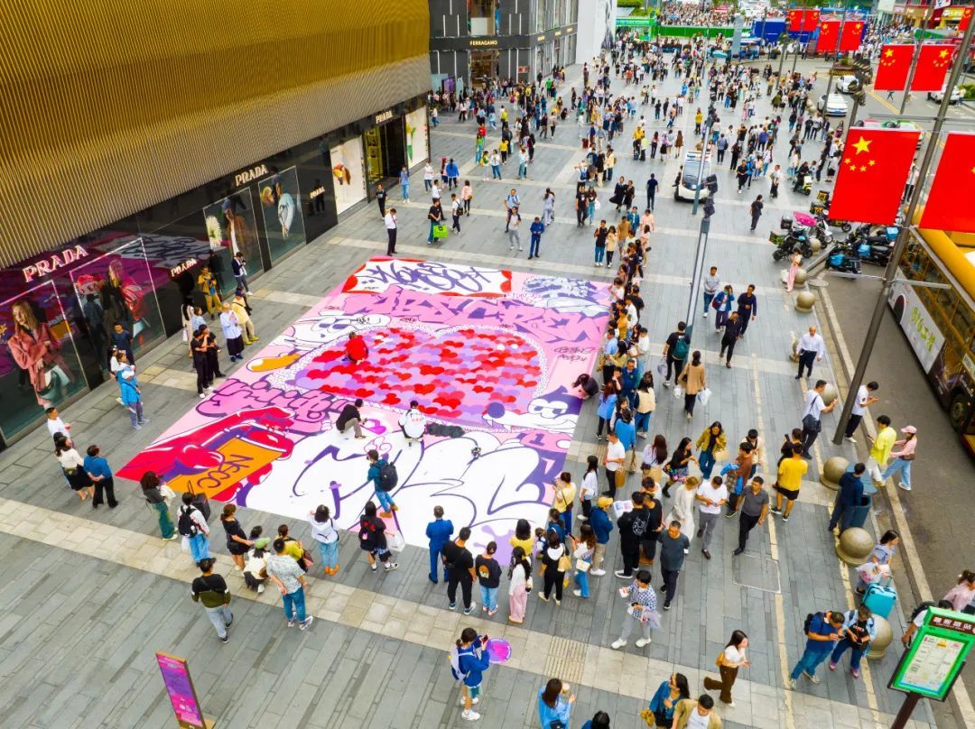 国庆黄金周前夕,在成都地标大熊猫I AM HERE下方的红星路步行街,国际知名潮流艺术家神山隆二(Ryuji Kamiyama)与国内先锋涂鸦艺术家ABS-CREW NOISE、NSC-CREW GOES携手,以地为纸,共创巨幅涂鸦作品。艺术家们以各自创作的经典涂鸦形象为基础,融合具有城市特色元素的符号,以极具视觉冲击力的明亮色彩,呈现个性十足的街头艺术表达。成都IFS于城市中心打造呈现的巨幅城市公共艺术作品,希望借此重塑在地精神及城市美学,以街头潮流文化元素塑造公共艺术,用新兴的艺术思维和设计彰显城市蓬勃生命力,活跃城市人文氛围。