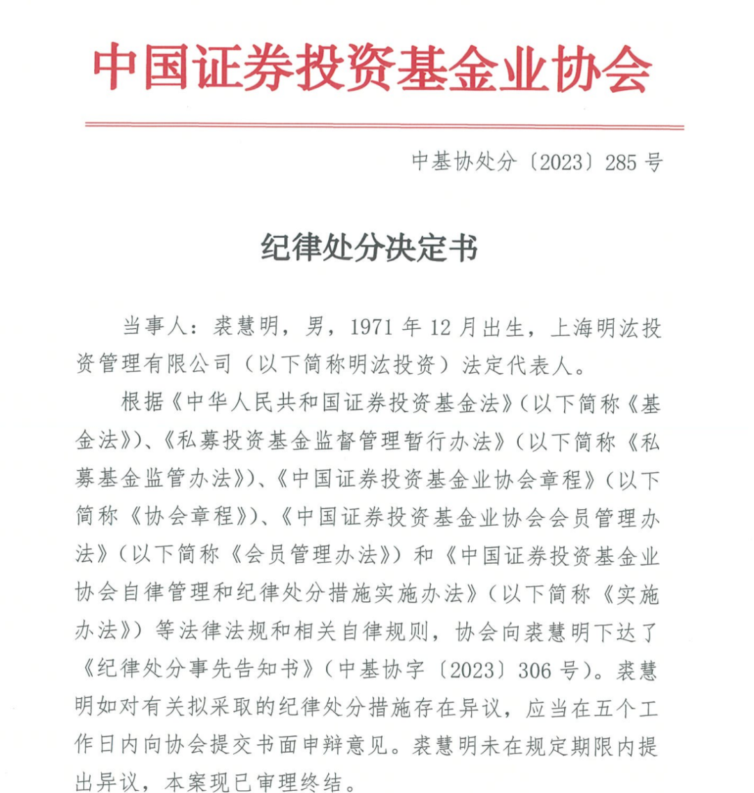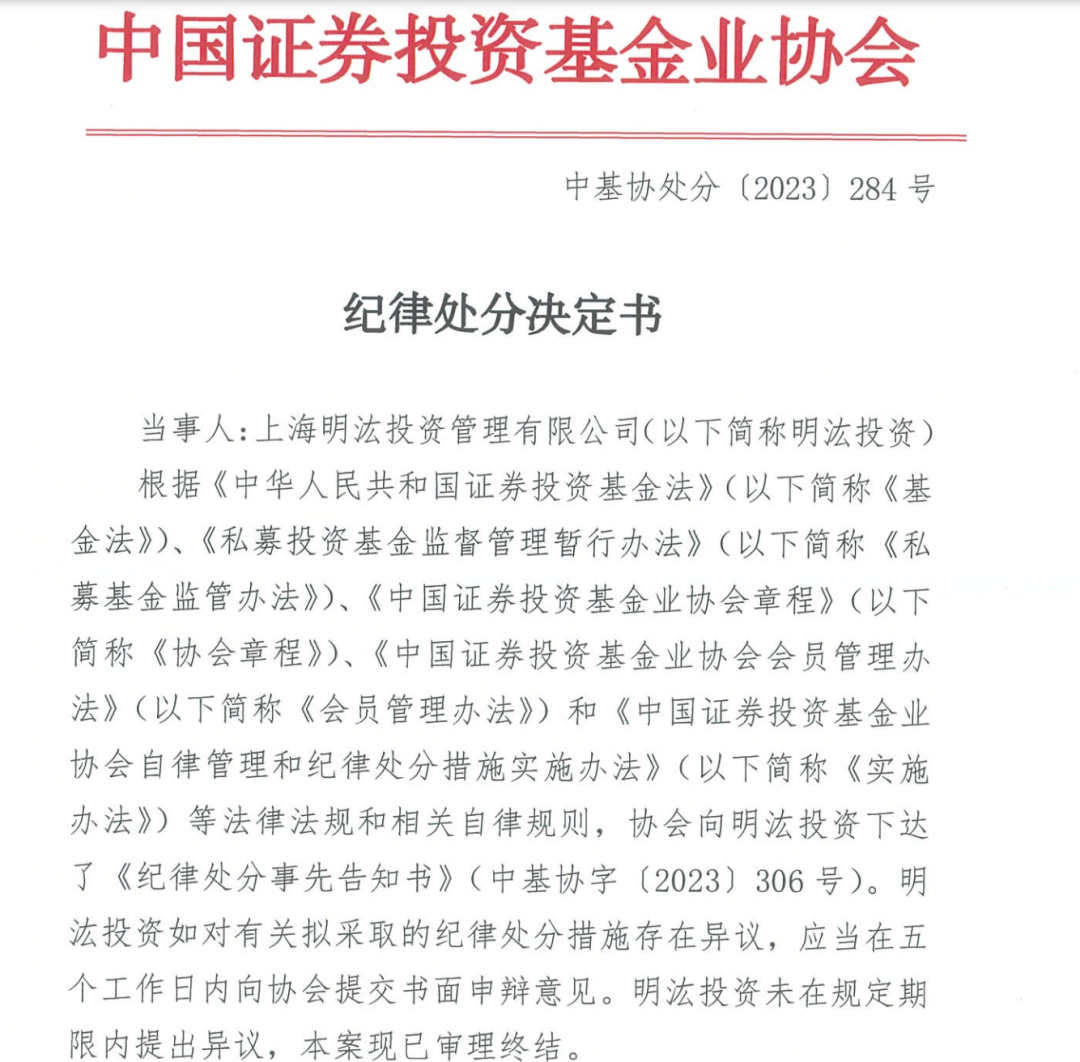 中国证券投资基金业协会(简称“中基协”)今日公布了对明汯投资的纪律处分决定书,公司将被中基协公开谴责,并暂停受理私募基金产品备案三个月。与此同时,明汯投资法定代表人裘慧明、合规风控负责人侯亚楠被警告,市场部原董事总经理徐世骏和市场部原渠道经理卓灵晨被公开谴责。