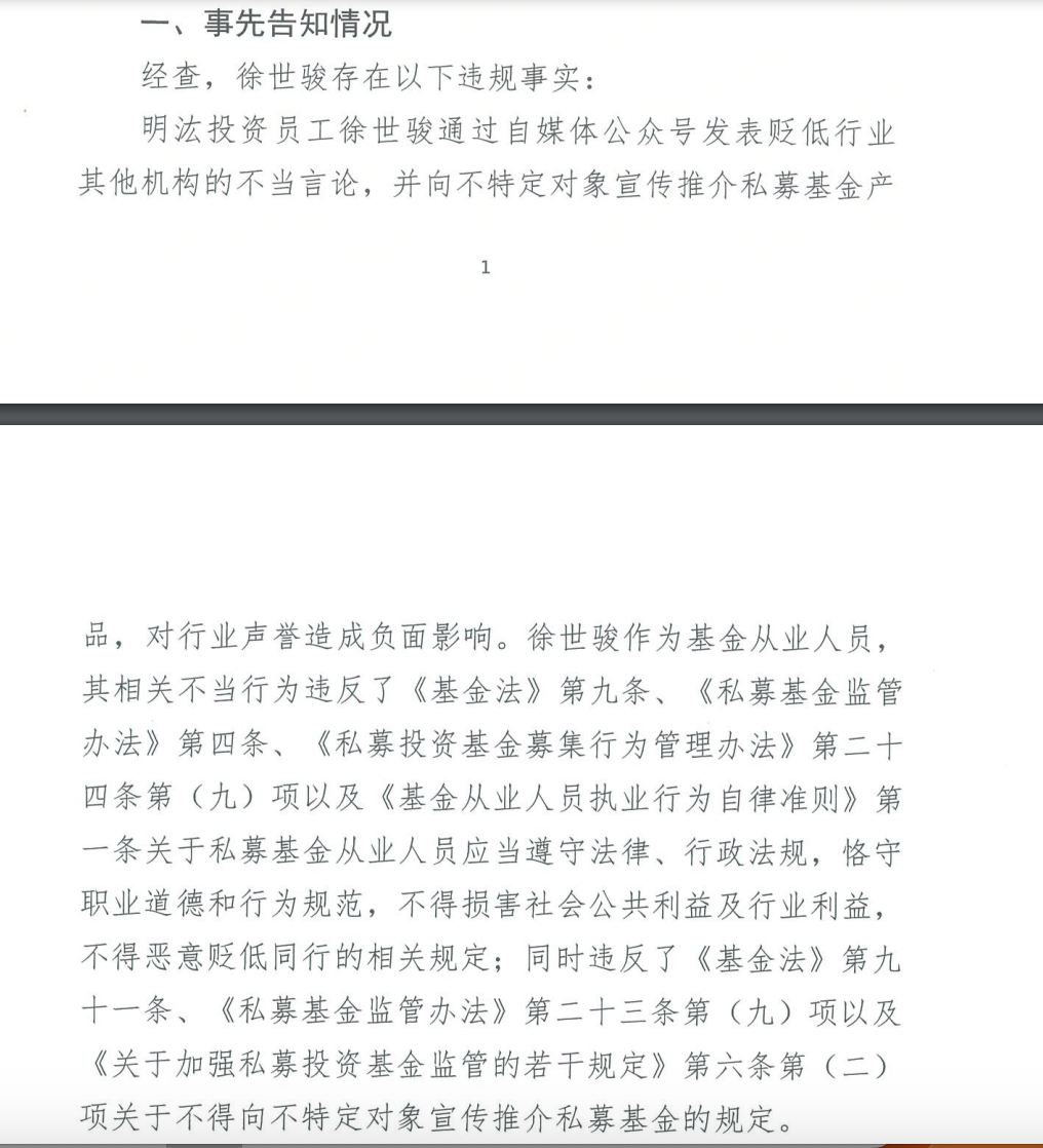 明汯投资9月初曾表示,2023年5月8日以来,上海市市场监督管理局和上海证监局等相关部门就市场部员工个人注册的微信公众号相关事宜展开核查。核查结果表明,相关员工在公司不知情、未授权的情况下发布相关文章,属于员工个人行为。但该事件同时也暴露了公司在管理上存在的问题,公司在监督管控员工不当行为、及时督促员工规范整改等方面,未实施有效内部控制,未尽谨慎勤勉义务。