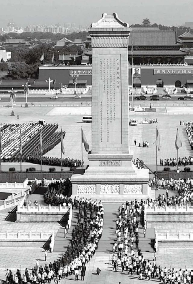 2005年9月3日,中国人民抗日战争暨世界反法西斯战争胜利60周年大型纪念活动在北京隆重举行。上午9时,在天安门广场举行向人民英雄纪念碑敬献花篮仪式。图为首都各界代表在瞻仰人民英雄纪念碑。