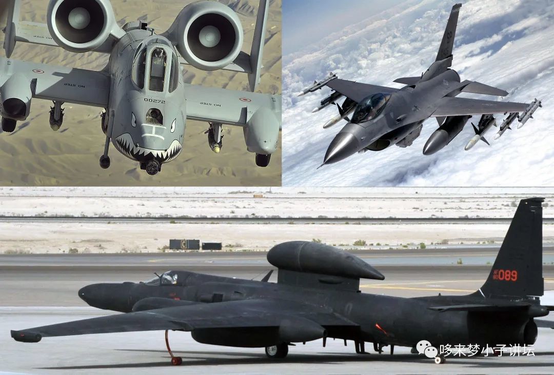 涂装颜色不同的美军A-10“疣猪”攻击机、F-16“战隼”战斗机与U-2“蛟龙夫人”高空侦察机。