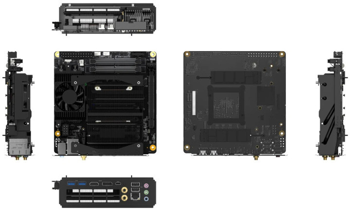 同时该主板配备了定制的散热模块,无需自行购买散热器但也无法更换,并且需要自行加装12cm风扇。此外,主板上还提供了PCIe 5.0×16显卡插槽和M.2 2230 Key-E规格的无线网卡插槽。其他接口方面,BD770i Mini-ITX主板上配有1个前置USB 3.2 Gen1(5Gbps)、1个CPU风扇供电和2个系统风扇供电接针,背部I/O接口包含2个USB 3.2 Gen2 Type-A(10Gbps)、1个支持显示输出的USB 3.2 Gen2 Type-C(10Gbps)、2个USB 2.0 Type-A(480Mbps)、1个HDMI2.0、1个DisplyPort1.4、1个2.5G 网口、1对WiFi天线口与3个音频口。