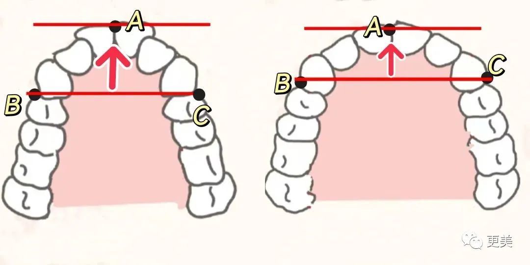 B点C点是两侧的唇角支撑点,A点是牙弓最前点,B、C点连线到A点的垂直距离越小,牙齿和牙槽骨能给口周的支持越大,反之就越小。