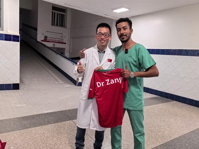 就在今年9月26日晚,驻塞达特医疗队的队长张建海收到摩洛哥同事Zakaria Jeddab的特殊礼物:一件摩洛哥足球队队服,并特地印上“DR Zang”。要知道,摩洛哥足球队刚获得世界杯第4名,是摩洛哥人民的偶像。