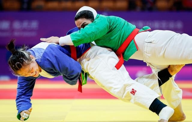 据官方资料介绍,起源于3500年前的克柔术是一种古老的直立制服式格斗,发源地是如今的乌兹别克斯坦所在地区。这项在中亚国家比较流行的运动,四年前在雅加达首次登上亚运舞台。而首次参赛的中国队在杭州收获不小,派出于丹、刘毅两名选手,分别夺得女子70公斤级、87公斤级两块金牌,命中率百分百。随着于丹昨天摘下中国首枚克柔术亚运金牌,这项神秘的运动也随之进入人们的视野。据说,前两天的馆内中国记者只有一两人,今天就来了十位左右。