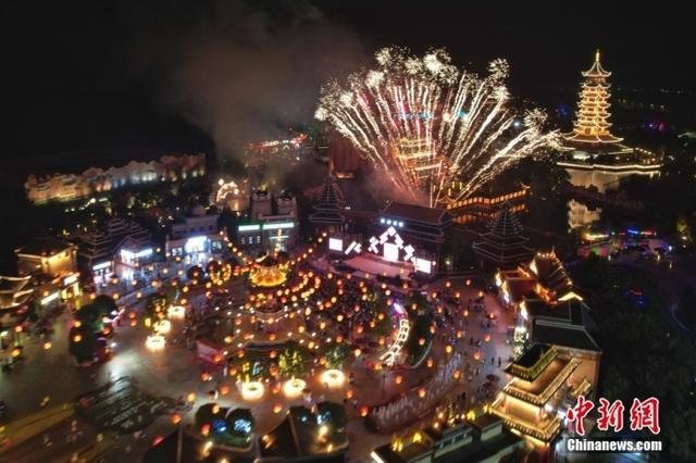 资料图:9月30日,漫天焰火在长沙方特升空,吸引众多游客围观。中新社记者 杨华峰 摄
