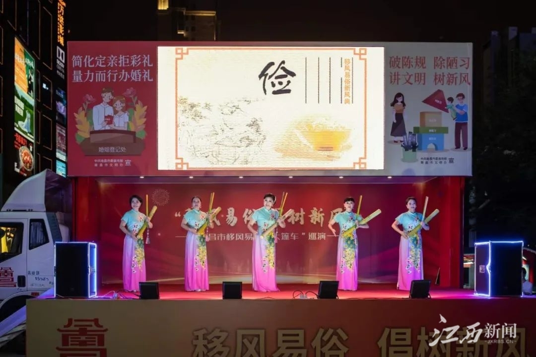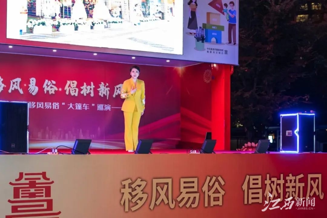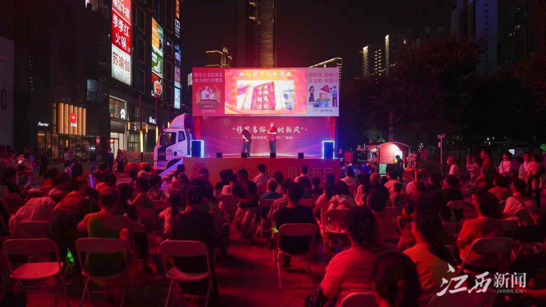 由省委宣传部、省文明办、省文联主办的移风易俗“大篷车”南昌巡演活动,10月2日晚在南昌市红谷滩区世贸广场举行,来自我省的文艺志愿者为前来观看演出的市民送上了一道精彩纷呈的文艺大餐。