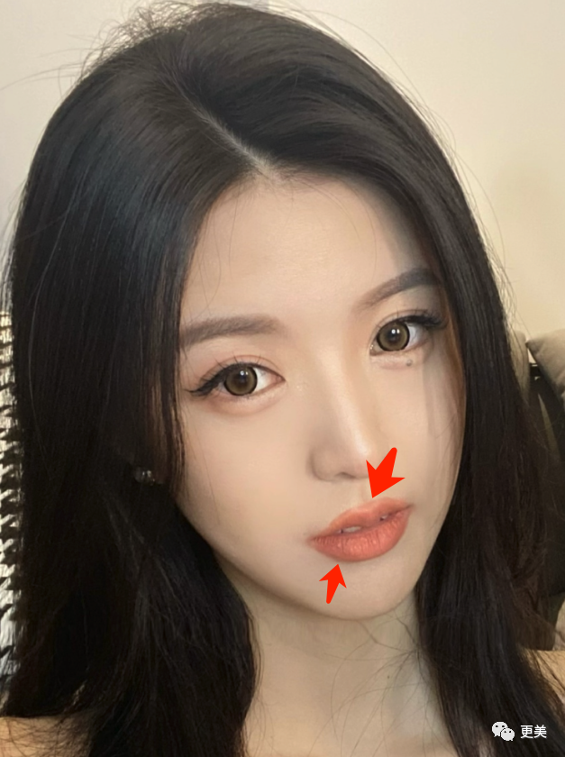 其次,化妆改善唇形的可能性更大。一些照片可以清晰看到上唇缘扩宽外涂,下唇缘下沿,用色彩增加唇部厚度,嘴角做厚度内收和横向延长,微笑樱桃唇打造完毕。