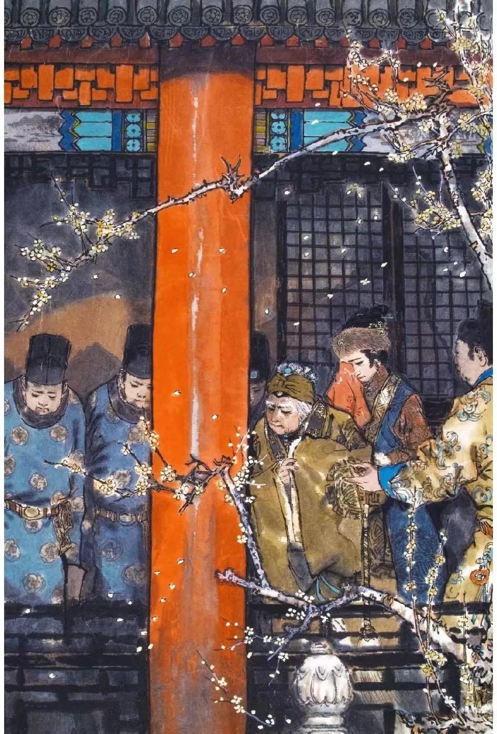 他曾去到故宫博物院《雍正十二美人》展览现场,亲眼观摩图画原件。着重观察清代时期画中人物形态、衣服花纹、家具器皿、花草树木乃至生活场景等——这是他创作《红楼梦》的主要参考。
