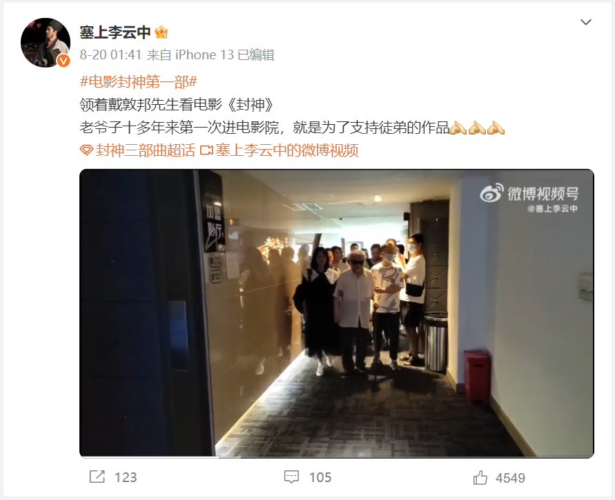 月前,电影《封神》的人物造型设计师、青年画家李云中发布了一条视频动态,画面中他携老师戴敦邦先生进场入座。