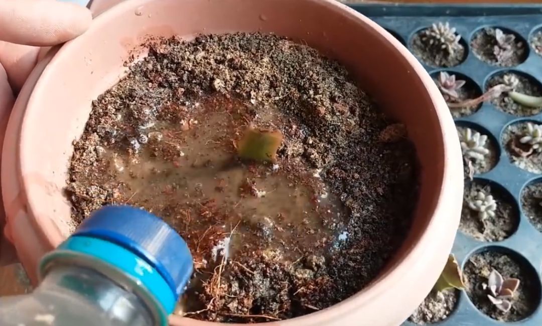 一个花盆里面可以扦插多个叶片,这里直接扦插两片叶子,种完之后稍微压实土壤,避免浇水的时候把叶片冲散了。之后就要摆放在早上有散射光的位置,环境通风,保持湿度。