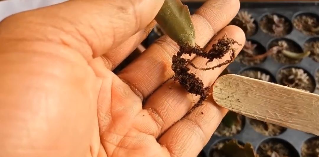 给大家看一下我养护了2~3周的蟹爪兰的叶片,也是扦插在育苗盆上面的,看看已经长出了小根,根系还比较细,但是根系已经长得比较长了。