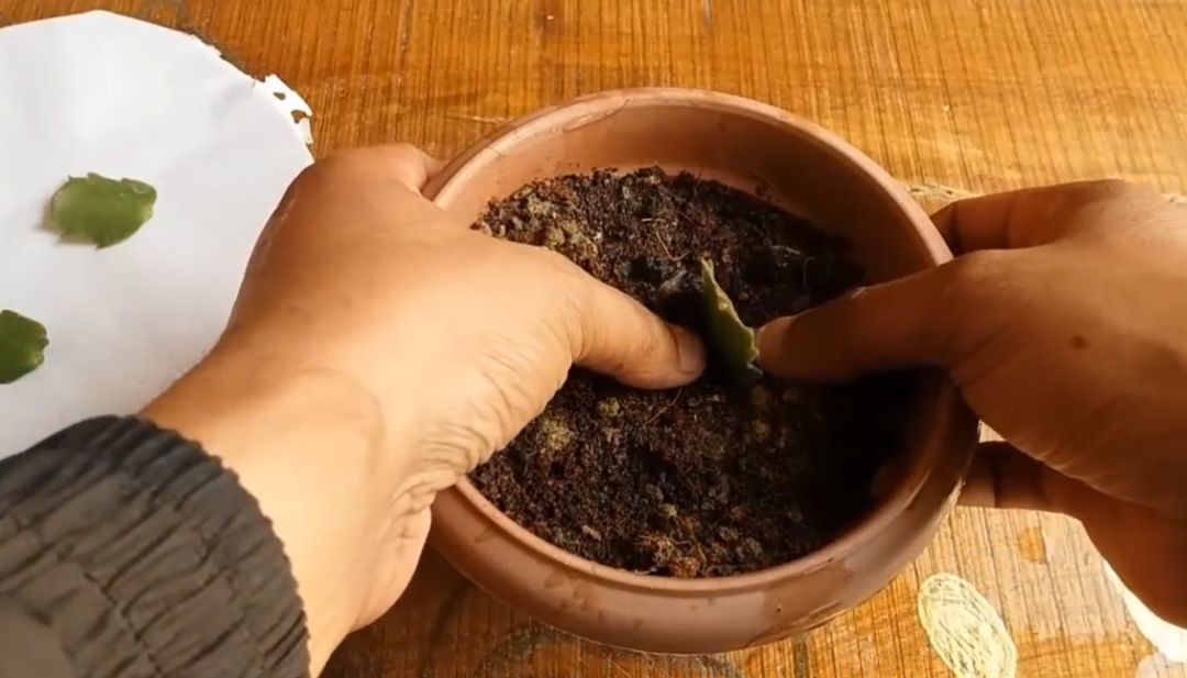 接着就可以慢慢在花盆里添加土壤,土壤不用放太满。花盆顶部大概留出2/10左右的位置,接着就浇水,把土壤完全浇湿润。土壤微微湿润之后,就可以将蟹爪兰的叶片扦插在土壤中。