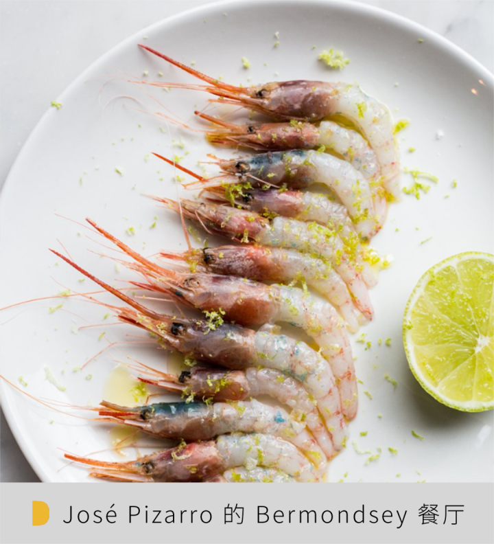 主厨 José Pizarro 的 Bermondsey 餐厅是西班牙美食的天堂,餐厅服务员会根据顾客的饥饿程度和偏好来为每位客人定制独特菜单。比如他们热销的餐品包括辣酱贻贝配酸面包,生蓝腹对虾配火腿炸丸子。