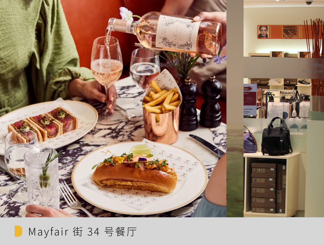今年夏天 Mayfair 街 34 号餐厅与 Floris London 香水店合作展开了香味餐厅的活动,从限量版鸡尾酒,如名为 Lavender Bellini 和 Riviera Spritz 的特调鸡尾酒,这两款产品的灵感都来自于 Floris 的独特香水气味。甜品菜单上,Floris Pannacotta 是一款由淡香草意式奶冻和玫瑰果冻制作,并用金箔装饰的特殊甜品。同时,餐厅的菜单也保留了招牌菜:西兰花、烤章鱼、龙虾汉堡和奶酪。