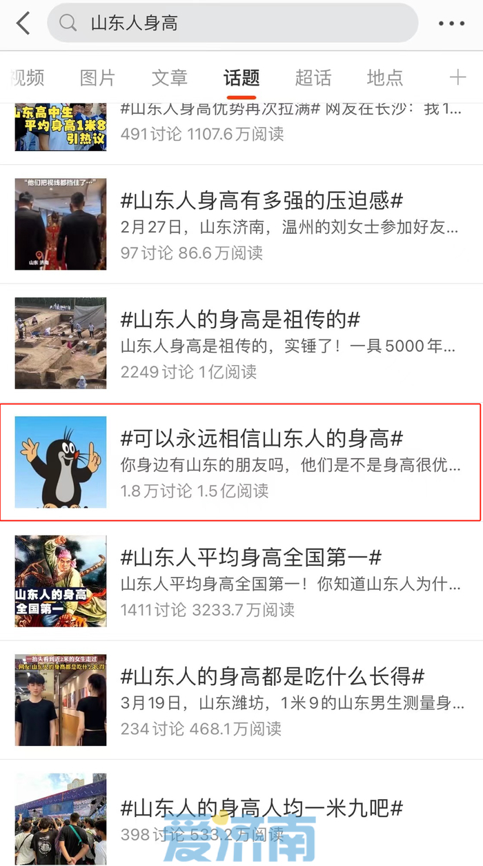 一直以来,山东人身高的话题都是热搜榜上的“常驻嘉宾”,时不时就会被网友拿出来热议一番。在微博上搜索“山东人身高”的字眼,话题热度最高的帖子为“#可以永远相信山东人的身高#”,共有1.8万讨论,阅读量超过了1.5亿。