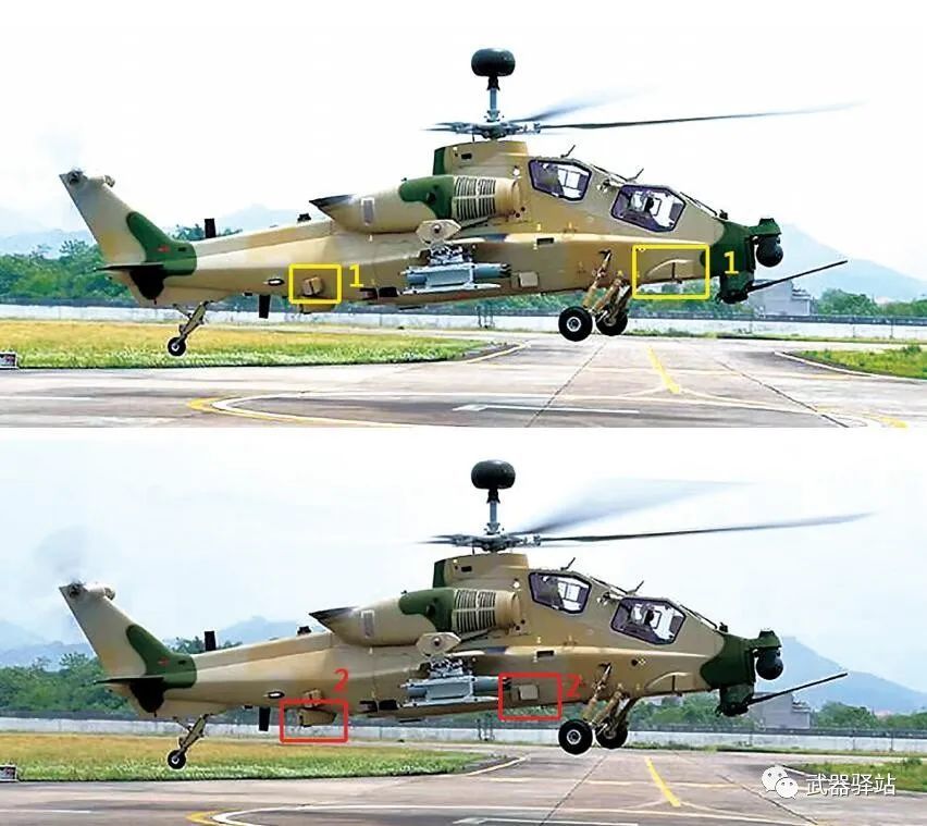直-10ME的另一大改进是新增的主被动防御系统:1是集成化光电告警设备,2是有源雷达干扰系统
