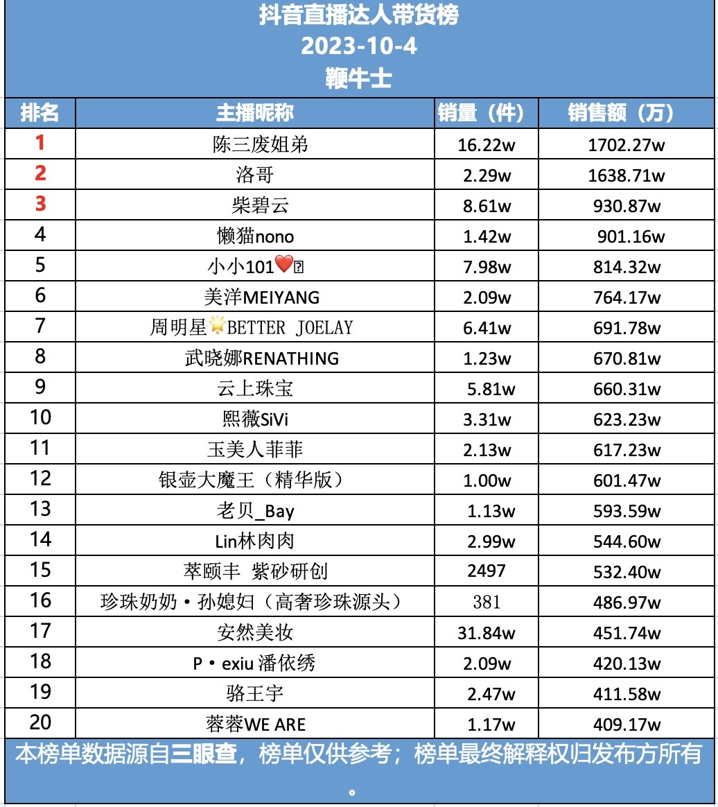 10月4日,抖音带货榜一是陈三废姐弟,销售额1702.27万元,榜二洛哥,销售额1638.71万元,榜三柴碧云,销售额930.87万元。