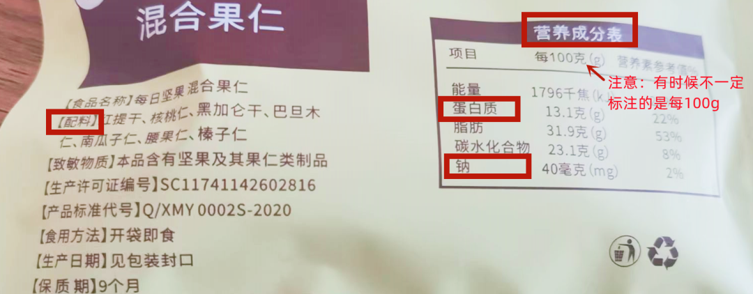 不过看营养成分表时要注意,一般的表格都是每100g这种食物里面各种成分含量,也有的是每份30g的含量,要结合食品总量一起看。