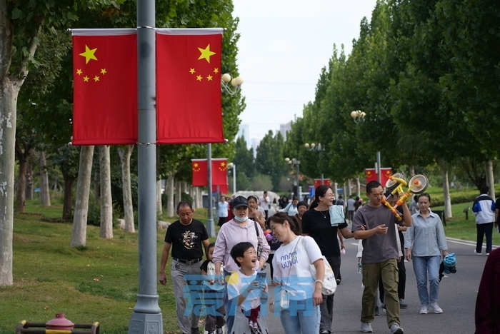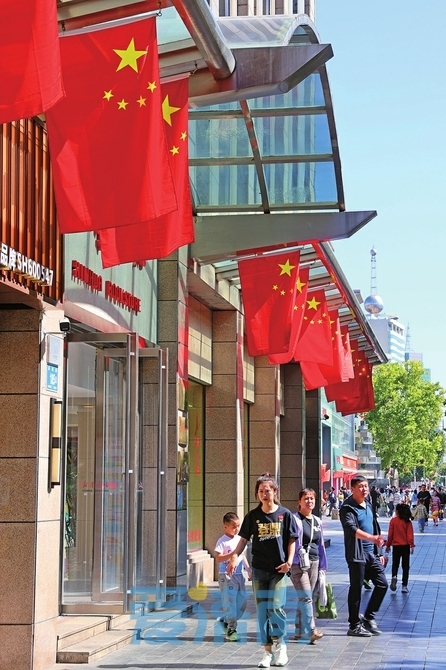 国庆节,济南街头花团锦簇,路灯灯柱、沿街商铺、商场、公园和广场等都悬挂着五星红旗,充满了欢乐祥和的节日氛围。不少市民带着孩子走上街头,手持国旗同欢共庆,为祖国喝彩。