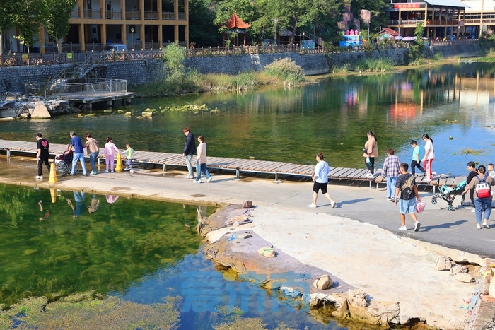 10月4日,众多市民游客打卡济南乐嬉谷雨林瀑布群亲近自然、赏景观瀑、放松身心,乐度假日。