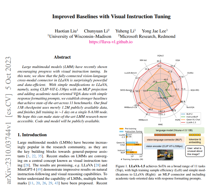 站长之家10月8日 消息:LLaVA-1.5是来自威斯康星大学麦迪逊分校、微软研究院和哥伦比亚大学的研究人员近期开源的一款全新的端到端多模态大模型,可与OpenAI的GPT-4V形成正面竞争。LLaVA-1.5在11项基准测试中都实现了新的状态最优(SOTA)成绩,包括视觉问答、图像 caption等任务,展现出了强大的多模态理解能力。