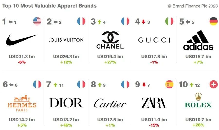 品牌价值被理解为品牌所有者通过在公开市场上许可该品牌所获得的净经济收益。在这个榜单中,四到十分别为古驰、阿迪达斯、爱马仕、迪奥、卡地亚、Zara和劳力士。
