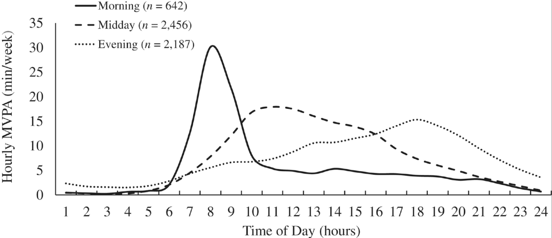 研究者从美国国家健康与营养调查(NHANES)数据库中收集到5285名健康成年人,并根据不同的中等至剧烈体育活动(MVPA)的日间模式,将全部的人群分为三类:上午组642人,中午组2456人,晚上组2187人。