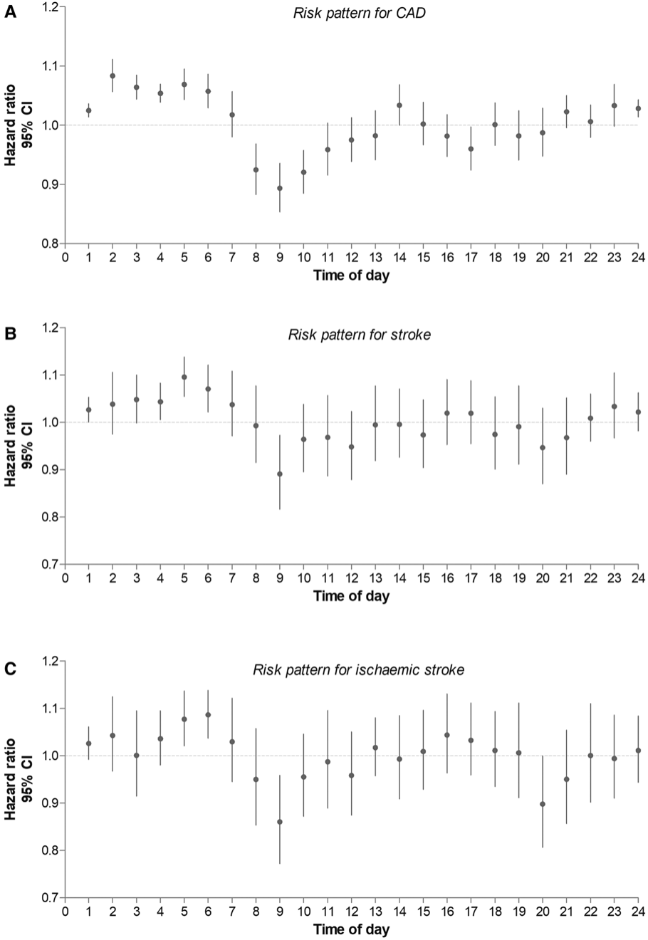 结果显示,与平均对照组相比,早上锻炼(8-10点左右)降低罹患冠心病、中风及缺血性中风的风险效果最好。