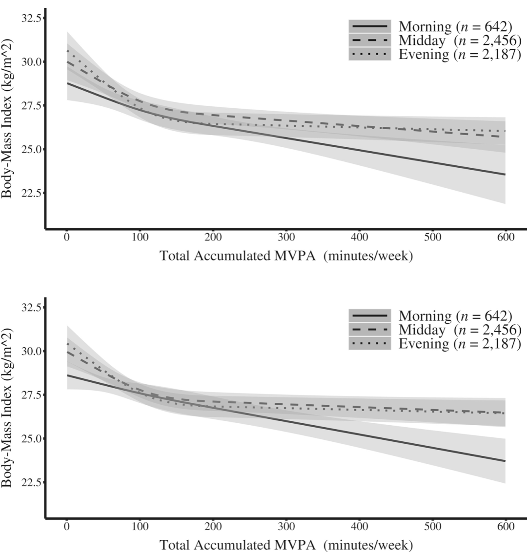 综上所述,这项研究证实了在早晨7-9进行MVPA在体重管理上的重要意义,可使参与者的减肥效率更高,因而有着更低的BMI和腰围。