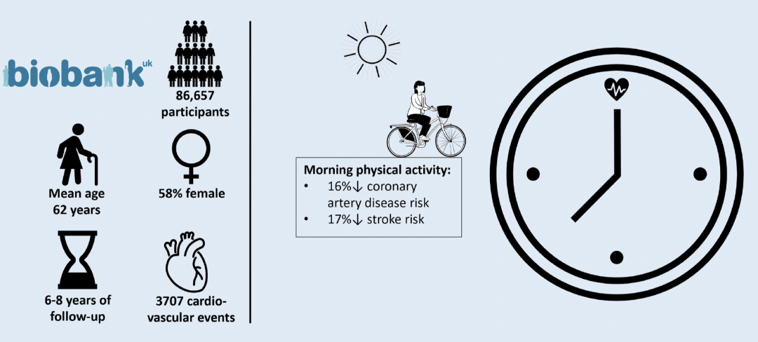 研究者表示,体育活动是预防心血管疾病的最有效措施之一,而本研究提供了一个很新的观点,即具体的运动时间段也是影响罹患心血管疾病风险的另一个独立因素。本研究得到的数据显示,无论每日的运动总量如何,在早晨8-10点左右锻炼与更低的心血管疾病发病率相关,尤其是女性。