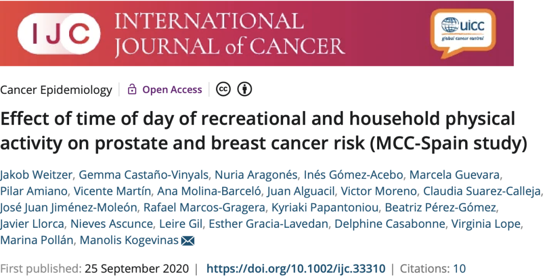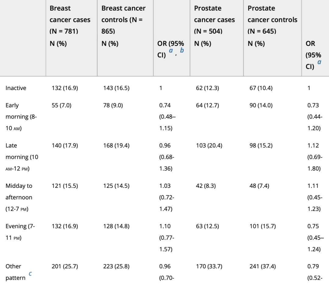 研究者从MCC-Spain中收集到5365名参与者样本,包括1438名女性乳腺癌患者和1004名男性前列腺癌患者,并依照性别、年龄、居住地匹配了1593名女性和1330名男性作为对照组。接着,研究者按照不同的运动时间将全部的参与者分为六大类:不运动、清晨锻炼(8-10点)、早上锻炼(10-12点)、下午锻炼(12-19点)、晚上锻炼(19-23点)、其他。