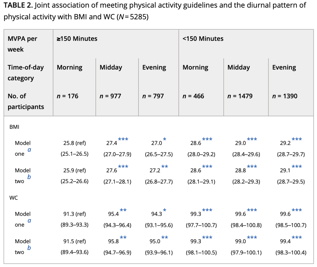但有意思的是,在调整了年龄、久坐行为、MVPA活动量等多变量之后,研究者发现,早上组有着比中午组和晚上组更低的身体质量指数(BMI)和腰围(WC)。