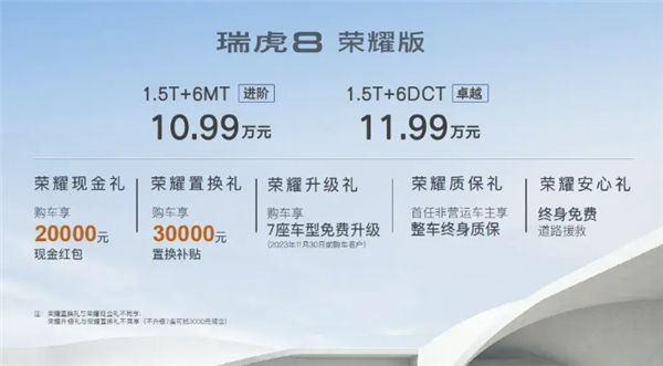 快科技10月10日消息,近日,奇瑞汽车正式发布了瑞虎8的2款新增车型。其中,进阶版售价10.99万元,卓越版售价11.99万元。