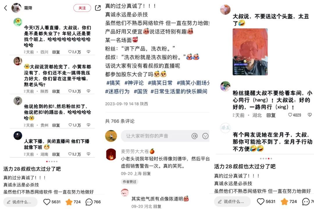 在小红书等社交媒体平台,许多用户甘愿充当自来水,为活力28宣传造势,传播大爷们直播时“淳朴可爱”的瞬间。在他们看来,“真诚就是必杀技”。@霜降 的一条旗舰店评论区汇总笔记收获了5631条点赞,足见用户对活力28品牌及其直播风格的认同。