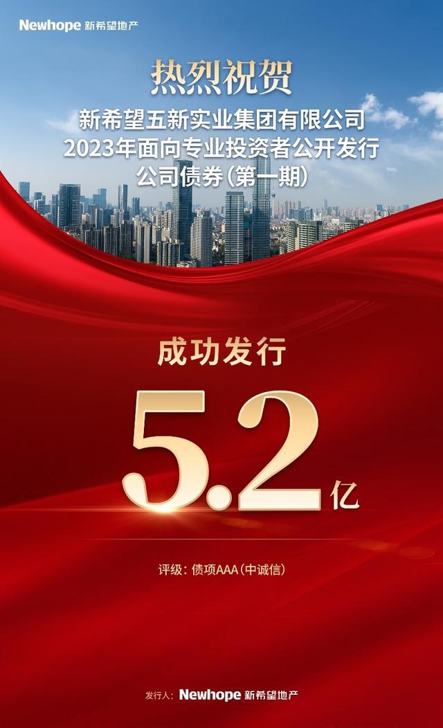 10月10日,新希望五新实业集团有限公司(下称新希望地产)成功发行2023年(第一期)公司债券,发行规模5.2亿元,发行期限2年期,主承销商为申港证券,发行利率为5.5%,由中诚信国际给予主体评级/债项评级AA+/AAA。