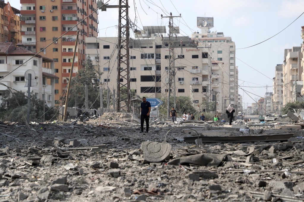 10月10日,在加沙城,人们走过被以色列空袭炸毁的建筑废墟。新华社发(里泽克·阿卜杜勒贾瓦德摄)
