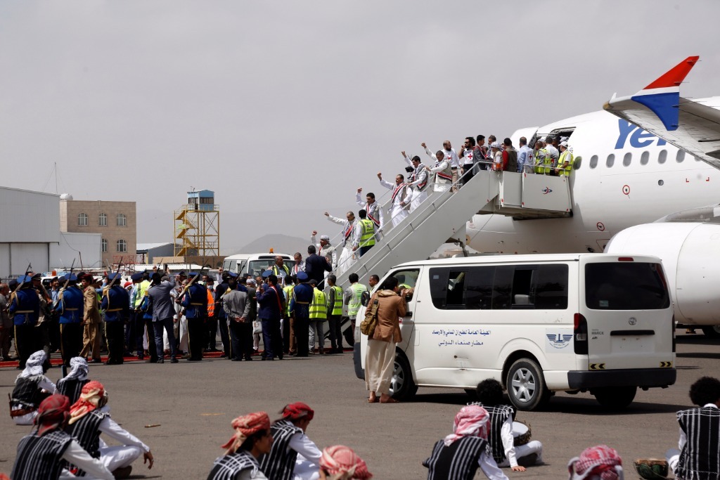 4月15日,在也门萨那机场,获释胡塞武装战俘走下飞机。也门政府与胡塞武装4月14日开始大规模换俘行动,双方将释放共计逾880名战俘。新华社发(穆罕默德·穆罕默德摄)